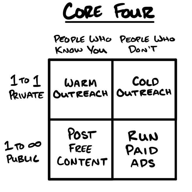 Hormozi's "Core Four" framework is stupidly simple, which is why it works. You have exactly four ways to tell people about your product: